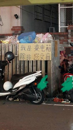 照片中,許多人似乎把被木質圍欄圍住的變電箱當作垃圾桶,導致上頭堆滿垃圾,宛如垃圾場,後來圍欄上多了一張「我是變電箱,除非您文盲」的紙板。根據兩張照片比對,應該是同一天拍攝,加上紙板後,垃圾看起來沒有變多。
